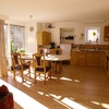 a) sehr große Wohnküche mit 2 x Doppelschlafsofa (eines mit einer Raumabtrennung aus Vorhängen); Kaminofen, Ledersofa, großer Esstisch; 7 m breite Süd-Fensterfront (effektiv von außen schattiert );