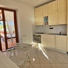 Durch eine Glastür gelangt man von dem Außenbereich mit Speisebereich in die voll ausgestattete Wohnküche mit Sitzecke und Fernseher. Links von der Wohnküche führt der Flur in das Doppelschlafzimmer mit einer wunderschönen geräumigen Terrasse und Meerblick sogar aus dem Bett, sowie das Badezimmer mit Dusche, und zu einem kleinen Schlafzimmer mit einem Doppelstockbett und Ausgang zur Terrasse.