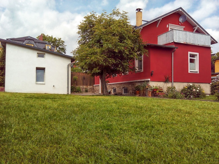 Pension am Stadtrand Dresdens. Das Haus liegt in einer ruhigen Nebenstraße mit großen Garten und sehr guter Verkehrsanbindung.