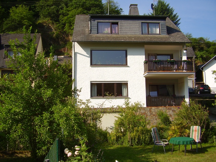 Die komplett eingerichtete Ferienwohnung mit separatem Eingang u. Parkmöglichkeit auf dem Grundstück befindet sich in Ortsrandlage, umgeben von Gärten u. bewaldeten Hängen, mit Blick in den Garten und auf die Burg Bischofstein. Sie besteht aus einem großen Wohnzimmer mit Küchenzeile und zwei zusätzlichen Schlafmöglichkeiten in bequemen Schlafsesseln, Doppelschlafzimmer, Dusche /WC u. Balkon. Eine Liegewiese mit Grillmöglichkeit lädt zum Sonnen und Entspannen ein. Rauchen können Sie auf dem überdachten Balkon. Tiere sind leider nicht erlaubt. In einer Weinstube genießen Sie Weine der Terrassenmosel. Ein Bäcker, Cafe' u. Restaurants sind in der Nähe. Wenige Gehminuten zur Mosel (Schiffsanlegestelle) oder in das romantische Baybachtal (Kultur- u. Naturweg "Forellenweg". Ausgangspunkt für Wanderungen u. Ausflüge an Mosel, Rhein, Hunsrück u. Eifel. Umfangreiche Informationen finden Sie in unseren Info-Mappen. Gästeticket für die kostenlose Benutzung von Bus u. Bahn in der Region,