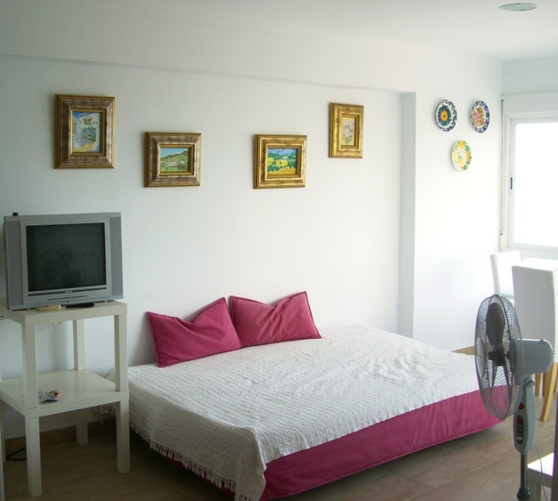Das Doppelbett befindet sich im breiteren Teil des Wohn-Schlafraumes und verfügt über ein eigenes Fenster, durch das man ebenfalls aufs Meer und die Palmen schaut. Das breite Schlafsofa vor dem Fernseher lässt sich in ein bequemes Bett verwandeln. Die Ecke mit Einbauküche ist mit einem Elektroherd mit Kochfeld ausgestattet. Im Badezimmer mit Badewanne, Waschbecken und WC steht auch die Waschmaschine.
