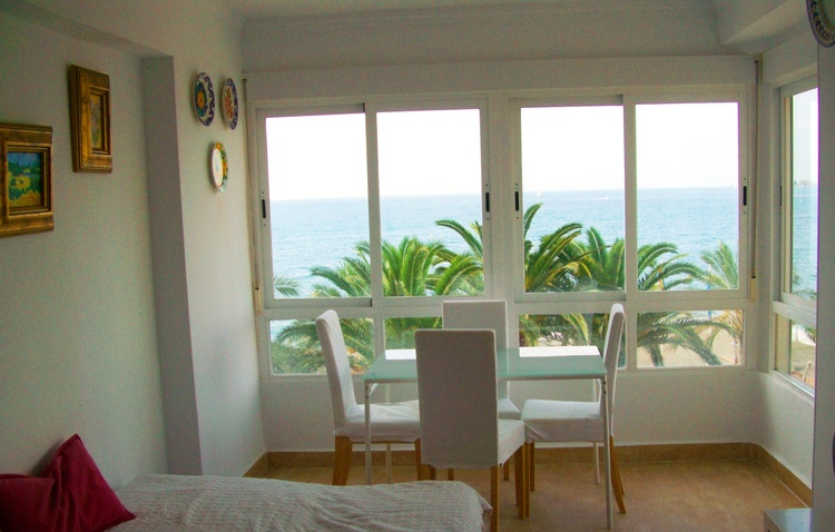 Sofort beim Betreten des Studios wird der Blick wie magisch von der breiten Fensterfront des Essbereichs angezogen - das Panorama mit grünen Palmen, blauem Meer und blauem Himmel ist einfach unbeschreiblich schön !