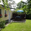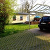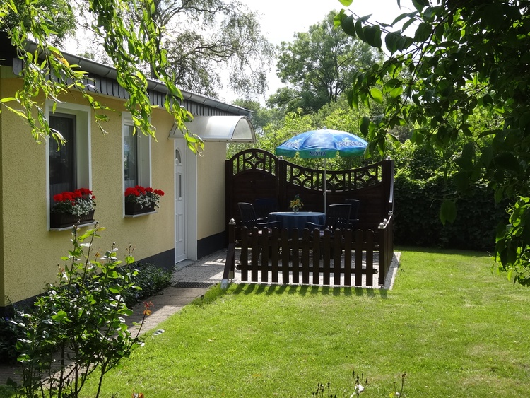 Der etwas abseits stehende Bungalow ist ungefähr 40 qm groß und grenzt an eine Wiese mit einigen Bäumen und Sträuchern.