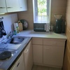 Elektroherd, Kühlschrank, Tiefkühlfach, Mikrowelle, Geschirreinrichtung, Wasserkocher, Kaffeemaschine, Toaster, Besteck