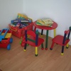 Spielecke mit bunten Kindermöbeln, Spielzeug, Büchern und Spielen.