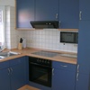 Die blaue Einbauküche ist komplett ausgestattet.