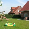 Im Garten stehen Schaukeln, Rutsche, Sandkasten mit Sandspielzeug, Bobbycars und große Spielzeugautos.