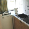 Kühlschrank, Geschirreinrichtung, Wasserkocher, Kaffeemaschine, Toaster, Besteck, Gläser