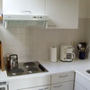 Elektroherd, Kühlschrank, Tiefkühlfach, Mikrowelle, Geschirreinrichtung, Kaffeemaschine, Toaster, Besteck, Gläser