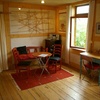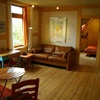 FEWO 1 liegt im 1. Stock, ist mit seinen Fenstern der Morgensonne zugewandt, hat Wohn- und Schlafzimmer (mit Doppelbett), einem gemütlichen Kachelofen, einer Küchenzeile mit Kühlschrank, Esstisch, einem Sofa, ein kleiner Schreibtisch. Die Wohnung ist einfach aber geschmackvoll eingerichtet. Malerei und Originalgrafik der Künstler des Hauses schmücken die Räume. Die Ferienwohnung hat eine kleines Duchbad und WC. Es gibt eine Minianlage mit CD/Cassette und Radio (...aber nicht die obigatorische Glotze!)