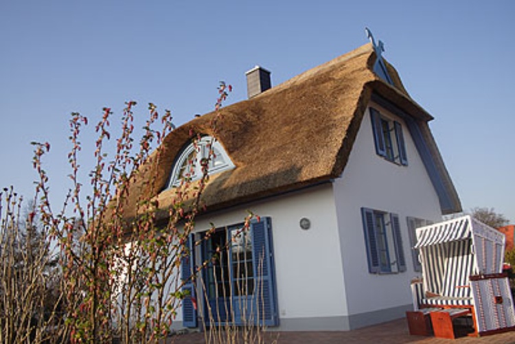 Das Ferienhaus ist regional typisch reetgedeckt mit den traditionellen "Pferdeköfen" am Giebel. Im Dachgeschoss befinden sich zwei harmonisch geschwungene Fledermausgauben. Die stilvollen Fensterläden runden das äußere Bild ab und schaffen zu jeder Jahreszeit ein optimales Wohnklima. Das Erdgeschoss ist komplett gefliest und mit einer Fußbodenheizung ausgestattet.