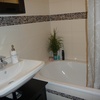 Das Badezimmer besteht aus einem Waschtisch sowie einer übergroßen Badewanne, die selbst zwei Personen bequem Platz bietet. Ein Gäste WC ist extra vorhanden.