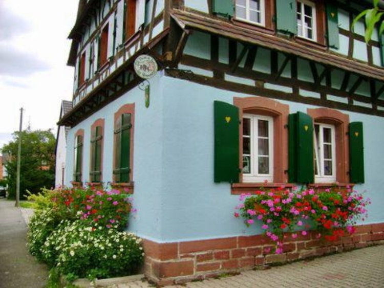 Die Türen sind dem elsäsischen Brauch gemäß polychrom bemalt. Der nahgelegene Radweg führt über die Deutsche Grenze.
